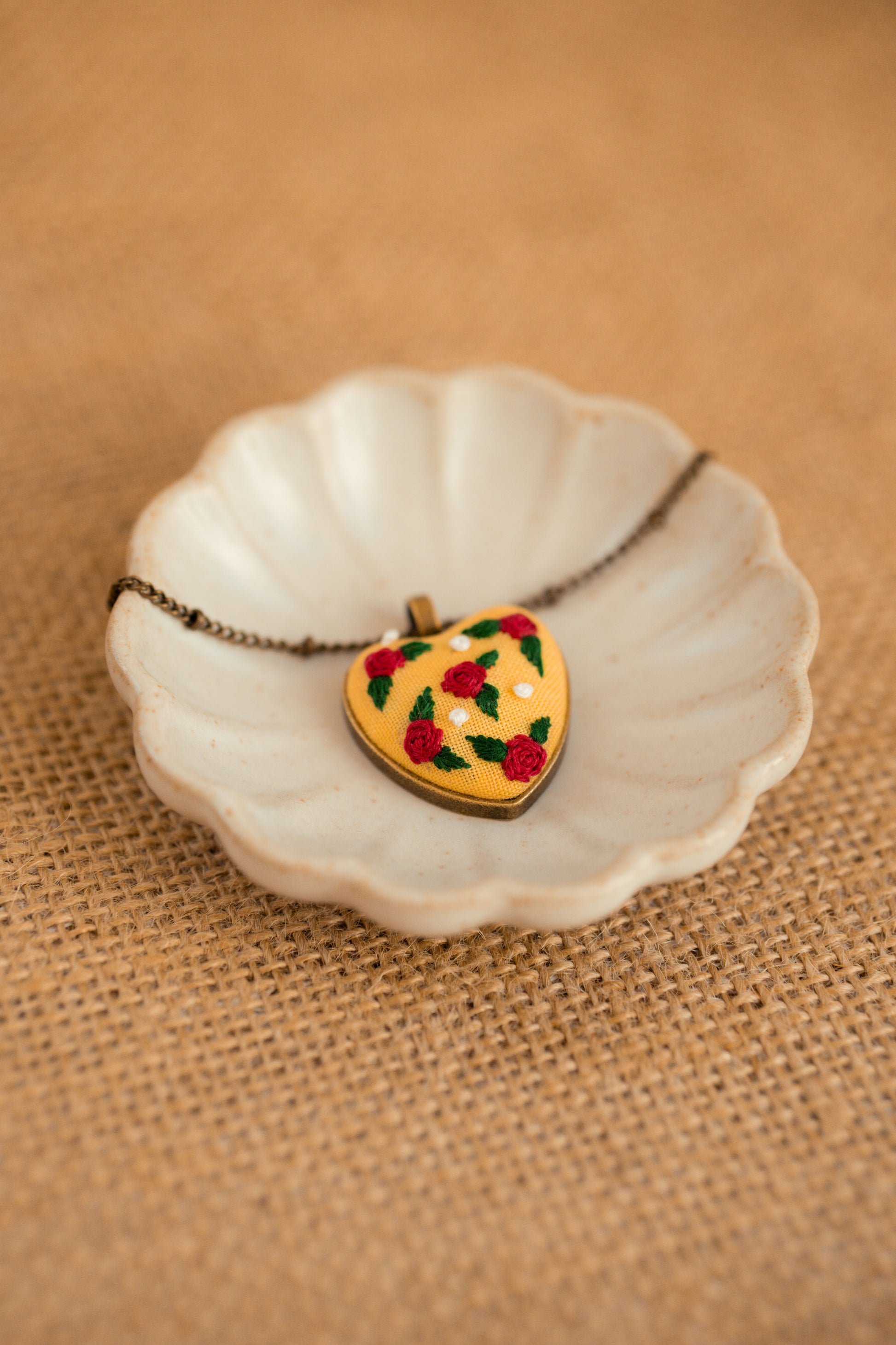 Vintage-inspired hand-embroidered heart pendant necklace. This necklace, adorned with embroidered roses, makes the perfect gift for that special one.